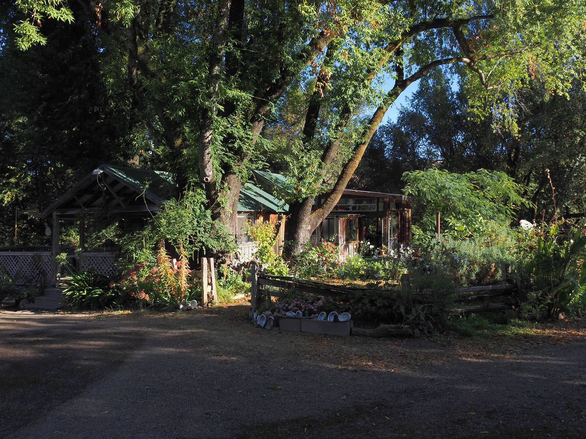 Nestled under Pepperwood Trees and surrounded by flowers, our cottage is small but cozy, warmed by our kerosene heater in the winter and with a small air conditioner for the heat waves of summer. The sunroom maintained by my sister is warm on sunny winter days and cool during the summer.
